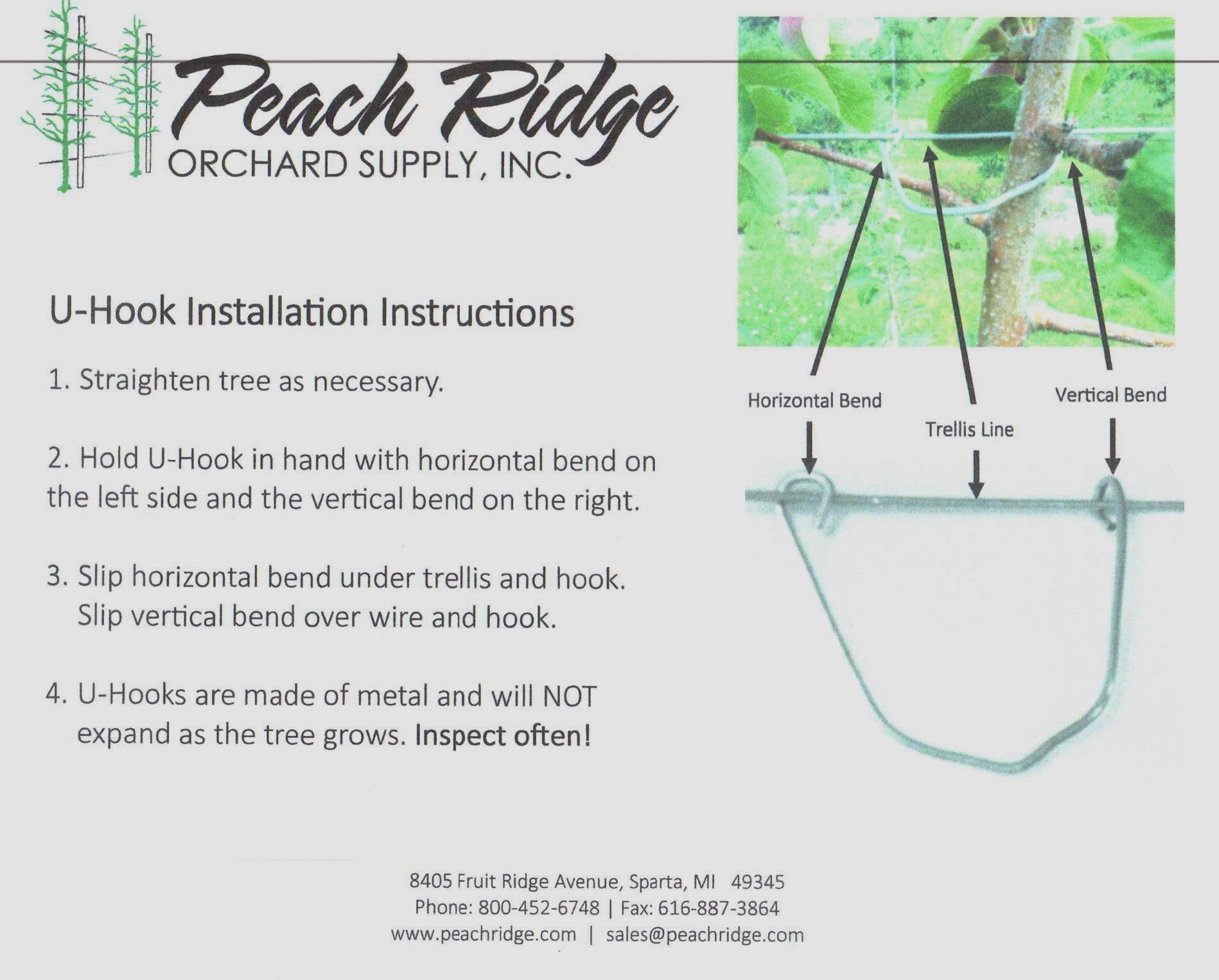 U Hooks - LargeStore/Tree TieSKU TRELUHOOKSLRG$345.00Bulk pricing available for quantities of 3 units or moreIn stockQuantity:1 Add More Add to BagGo to CheckoutBuy more, save moreQuantityPrice per itemDiscount3 items$320.007% off10 items$299.0013% offSave this product for later Favorite Favorited View FavoritesShare this product with your friendsShareSharePin itU Hooks - LargeStore/Tree TieProduct Details Galvanized 3" U-Hooks can be used to hold trees and irrigation lines to trellis systems Patented design holds tight to the line where it is applied, holding U-Hook firmly in place Inexpensive, long-lasting, and easy to apply Large size comes 2500 per box PLEASE NOTE: U-hooks are metal and will not expand as the tree grows Contact us for Quantity Pricing (pallets of 50 cases per skid 2500lbs 48"-40"-42") Please see Installation directions below: Show More